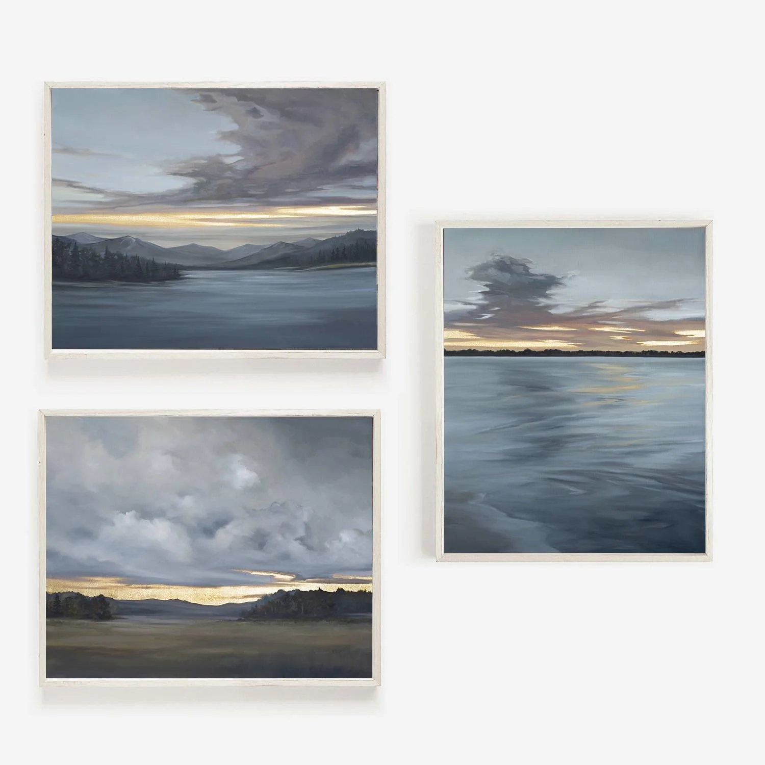 Allie’s work is about hope - weathering the literal and metaphorical storms, and seeing the light at the horizon. Aesthetically, drawn to the contrast of dark, moody skies, against the rich glow of 24 karat gold leaf.