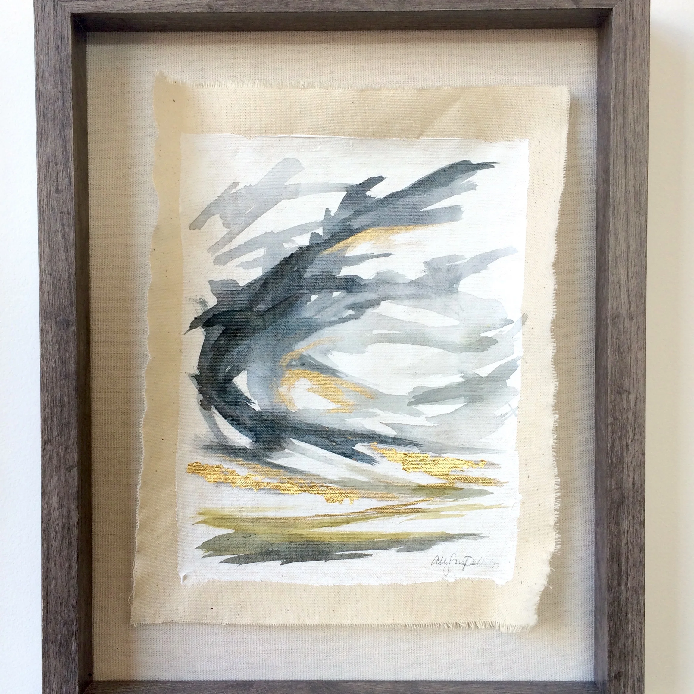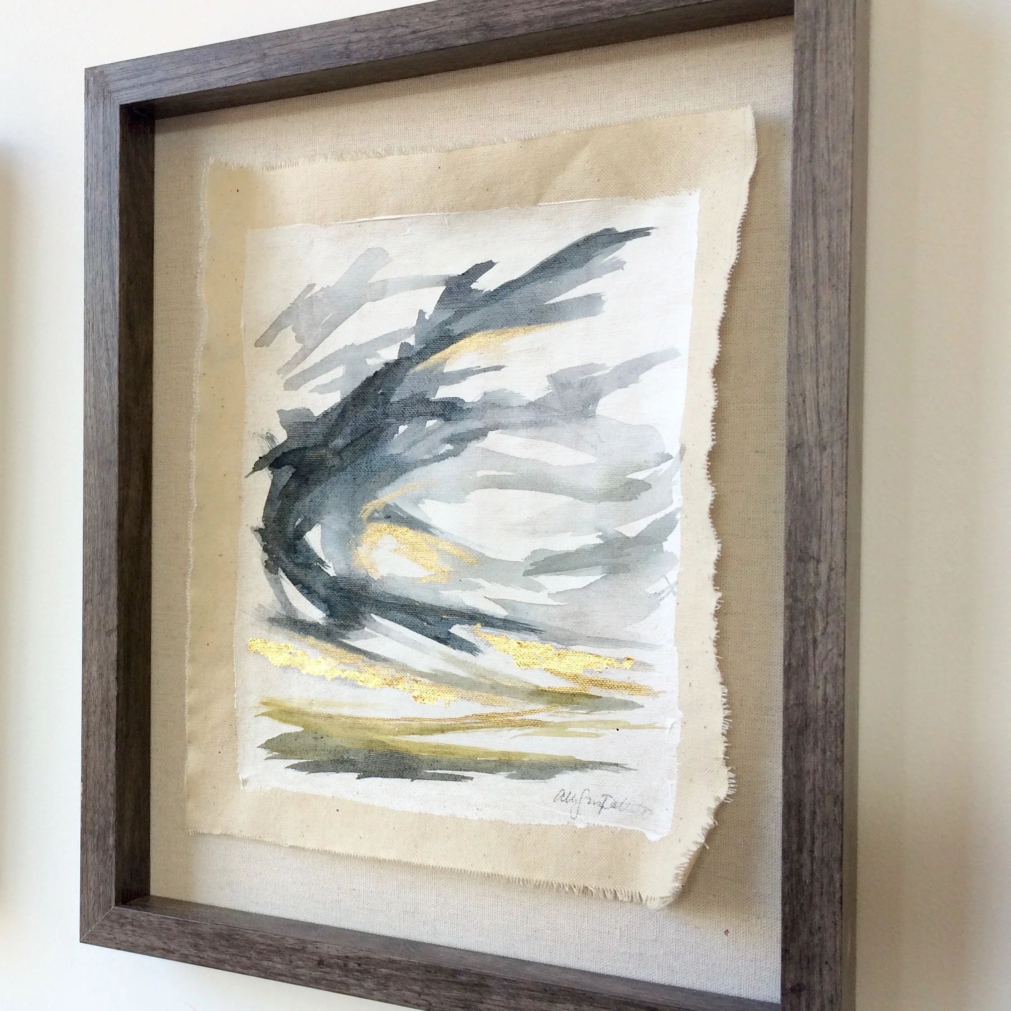 If selecting the framed option, the piece of canvas will be mounted on a foundation of canvas, in a deep 11" x 14" frame of driftwood. The frame is free of glazing (no glass) in order to let the piece breathe and capture the full range of texture and depth.