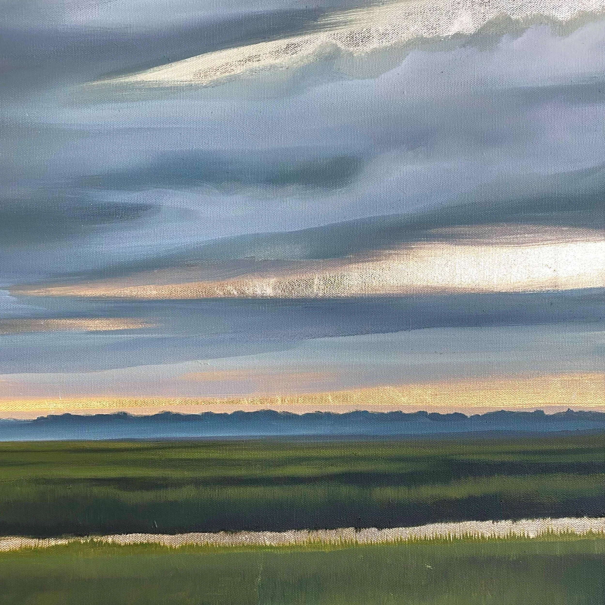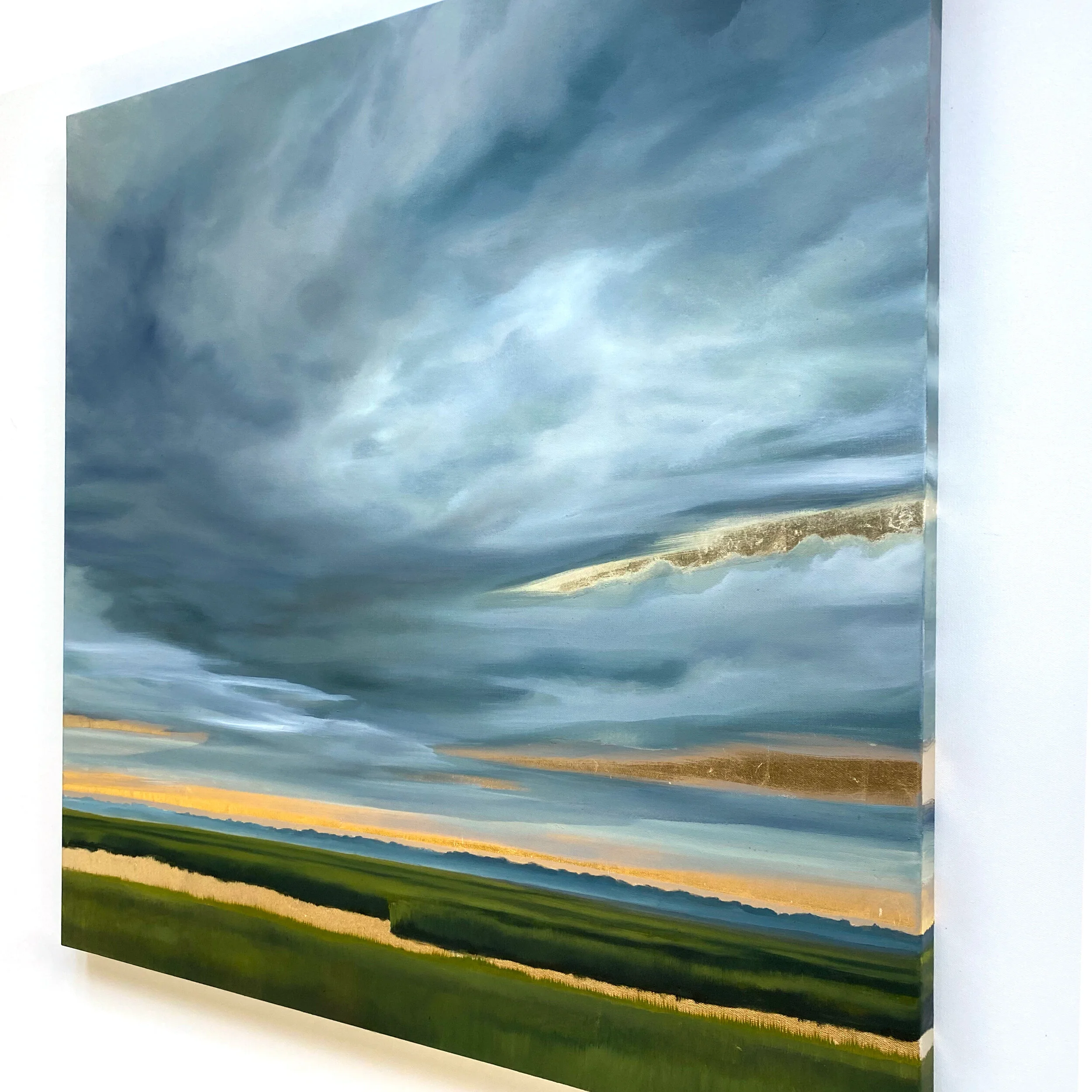 Mixed media and a unique combination of genuine 24k yellow gold, 22k moon gold and 12k white gold leaf on canvas, 40” x 40”.