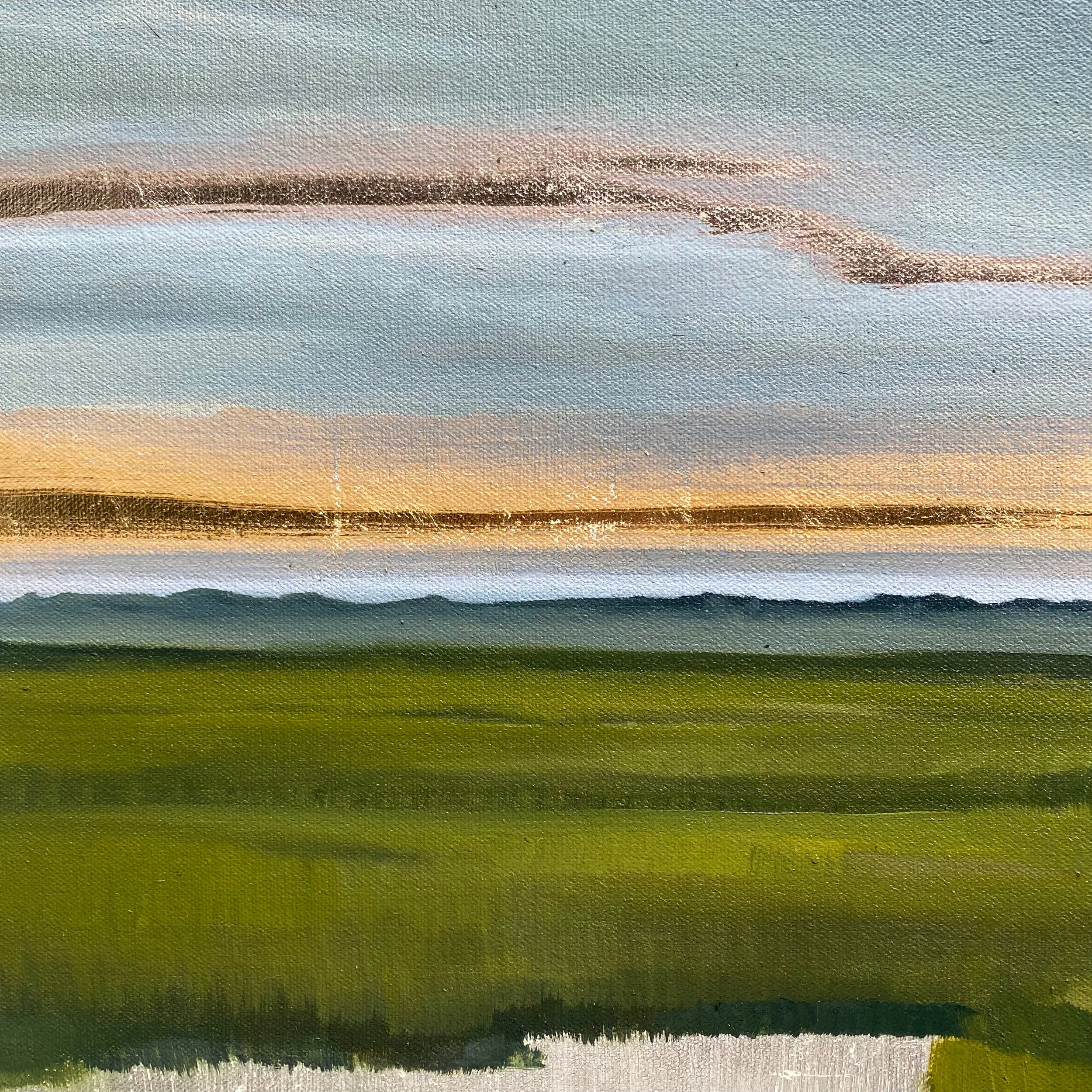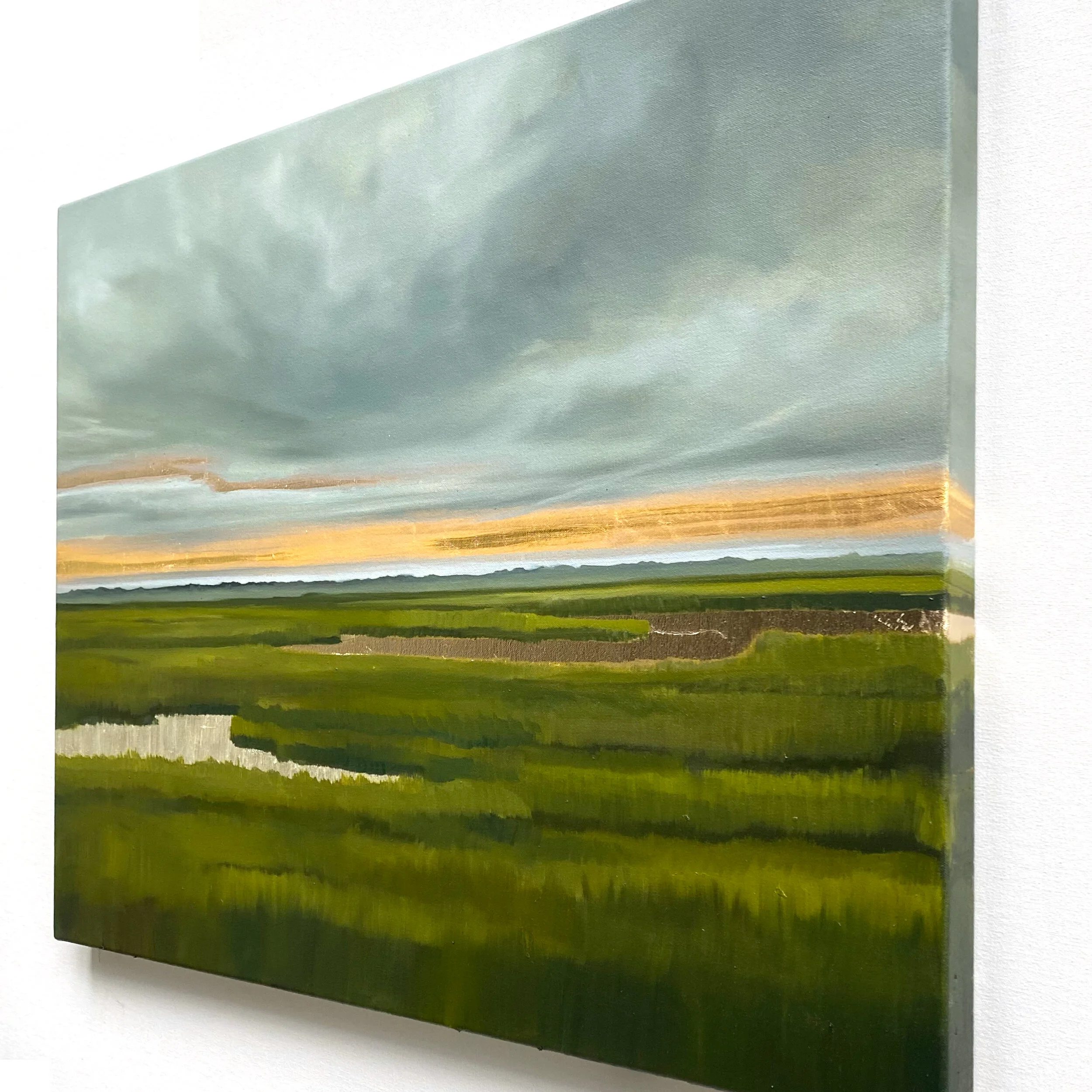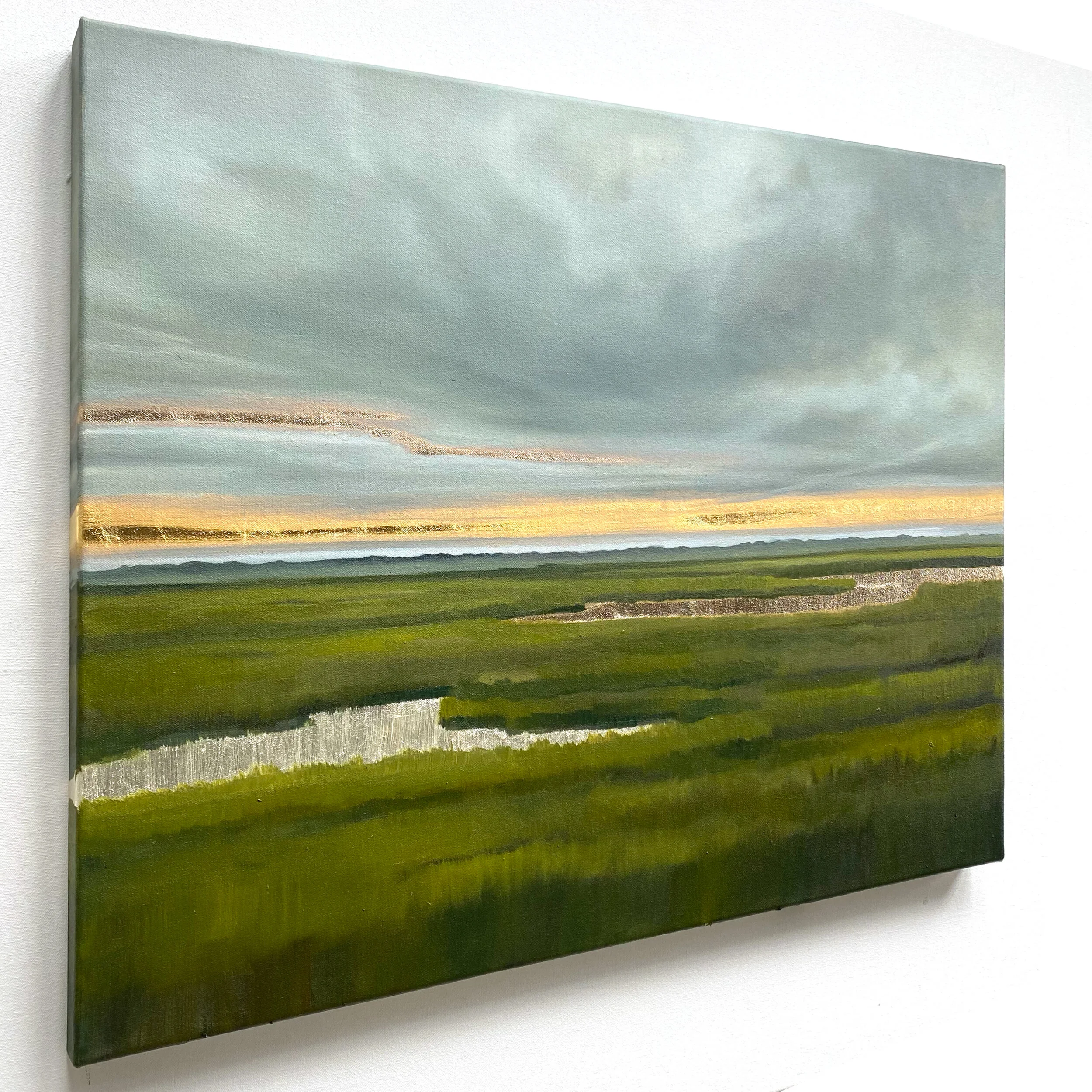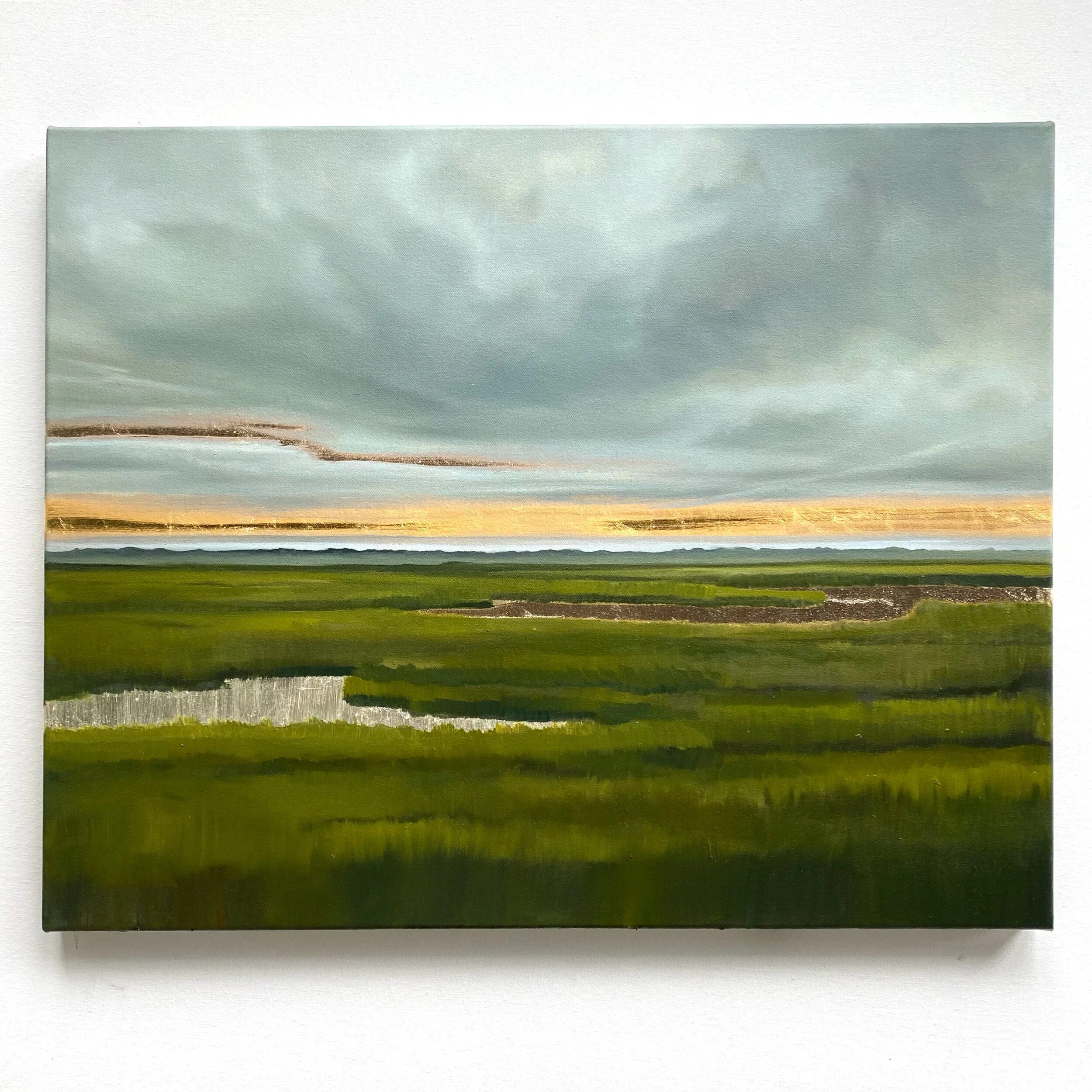Mixed media and a unique combination of genuine 24k yellow gold, 22k moon gold and 12k white gold leaf on canvas, horizontal, 24” x 30”.