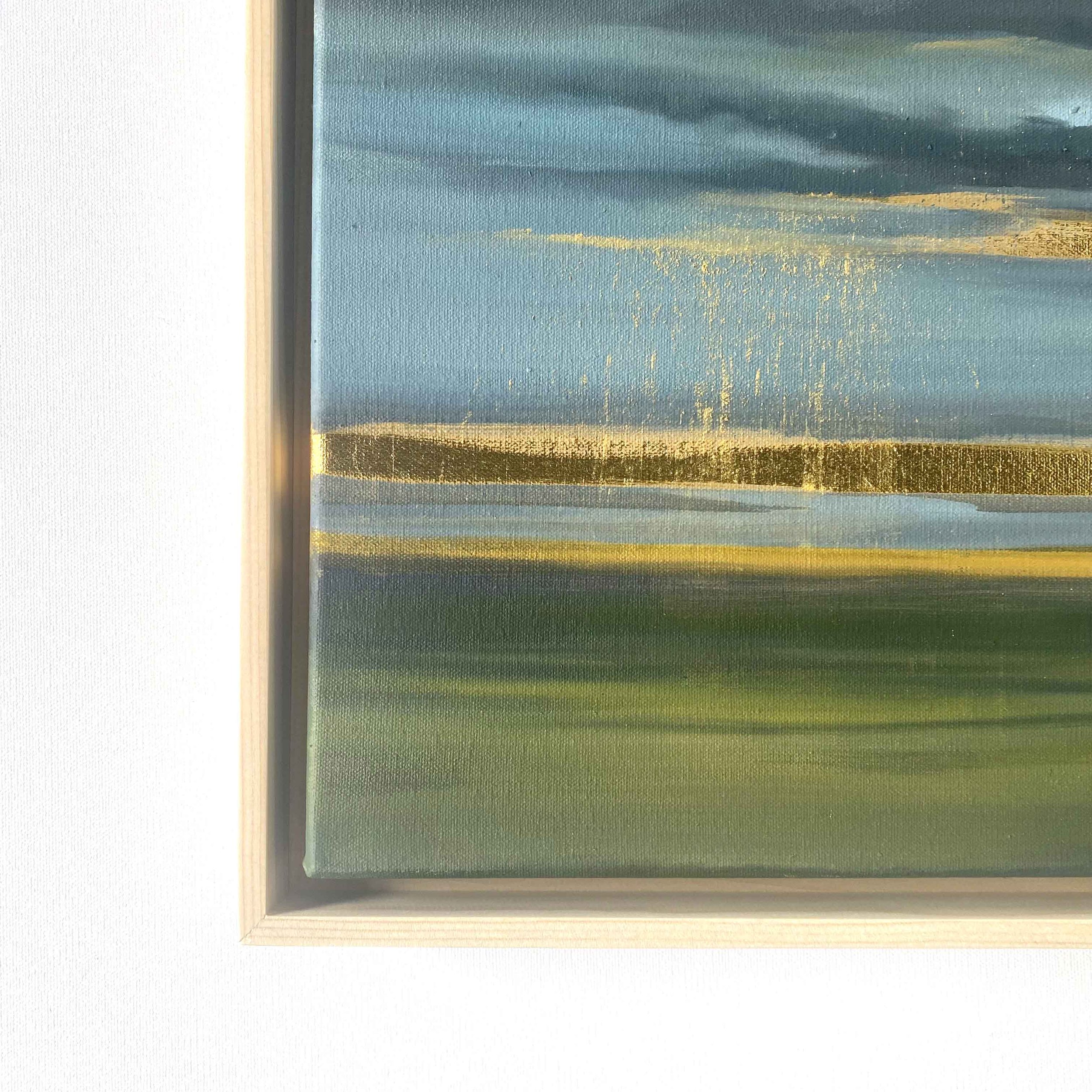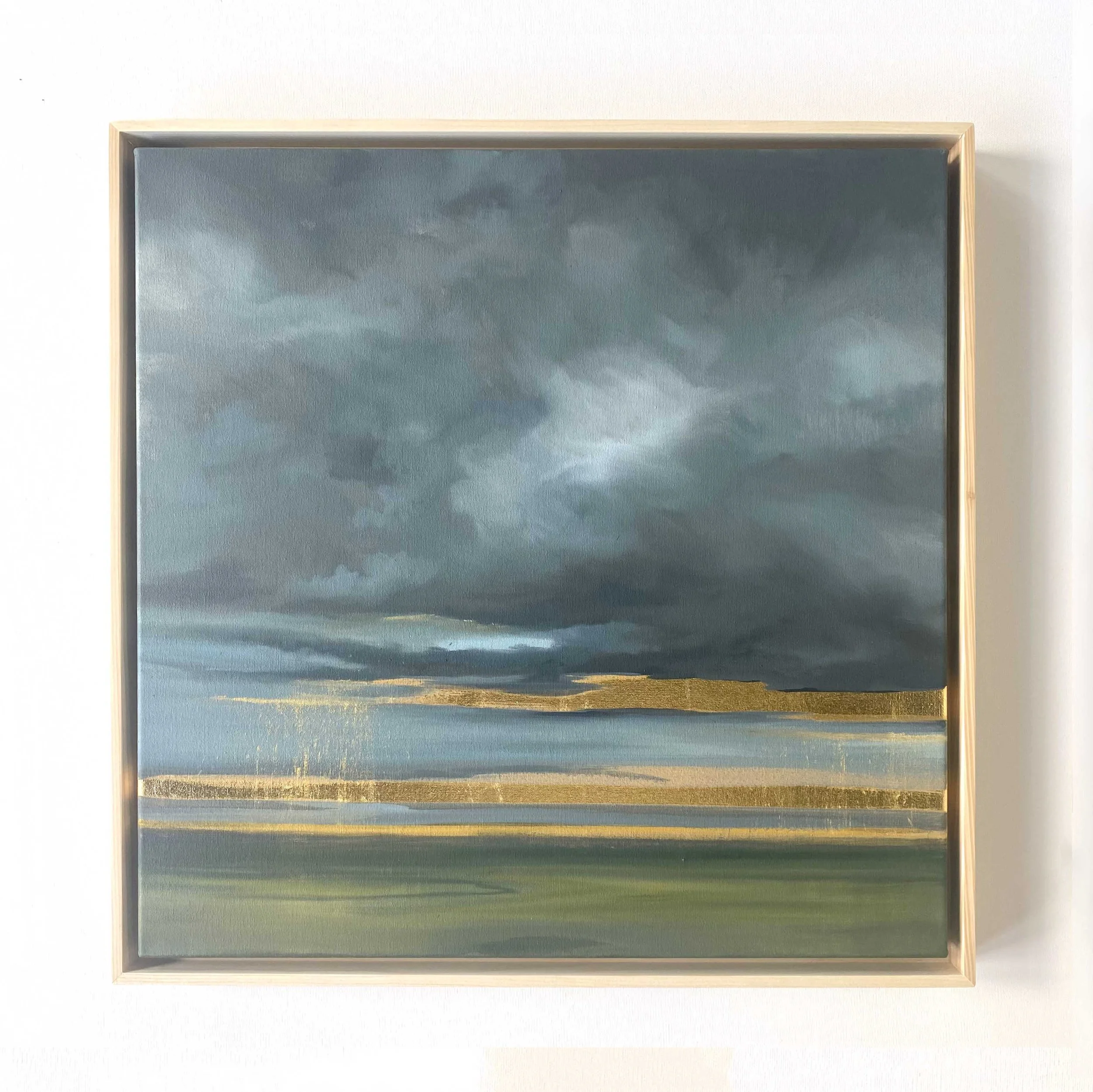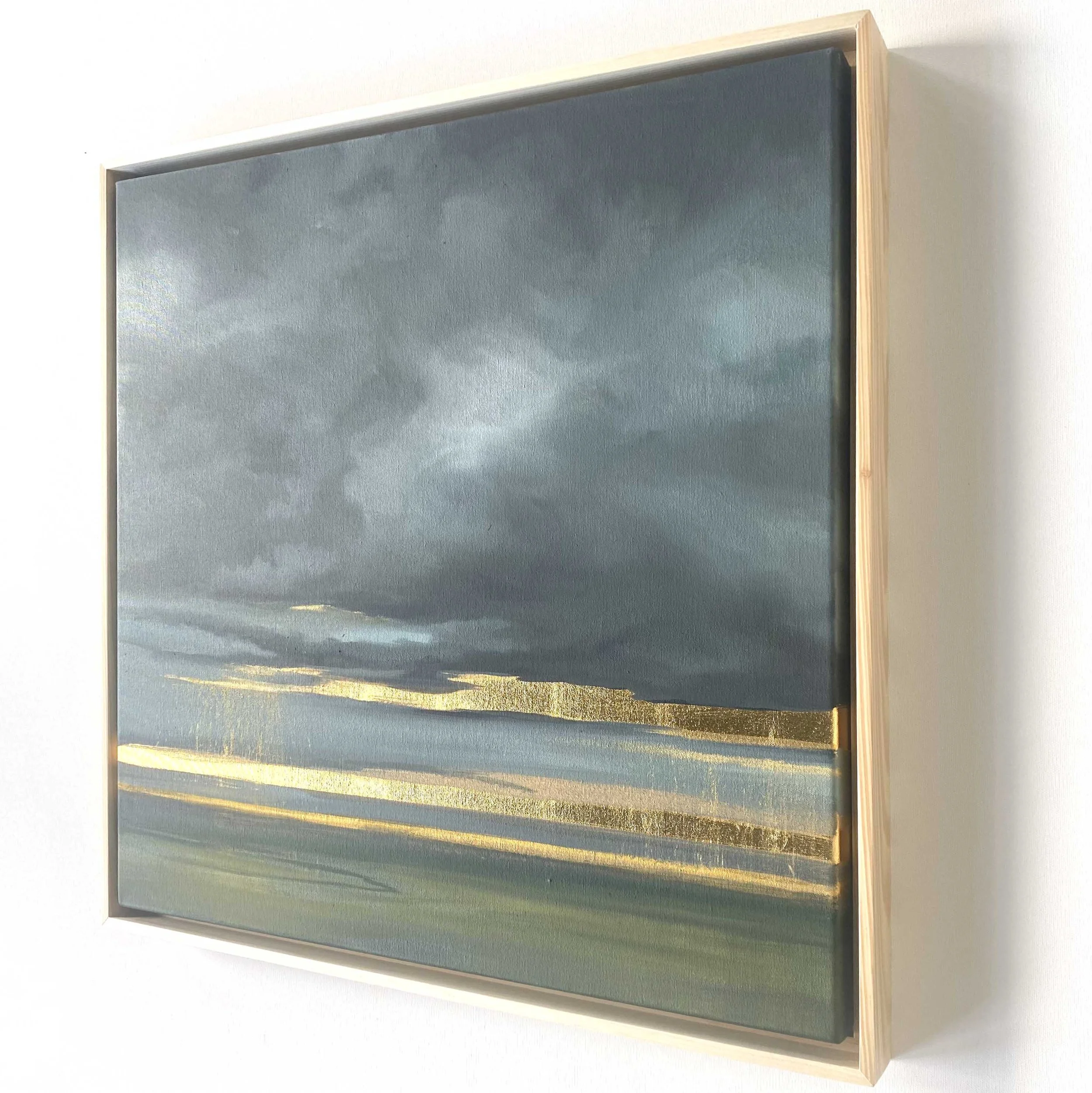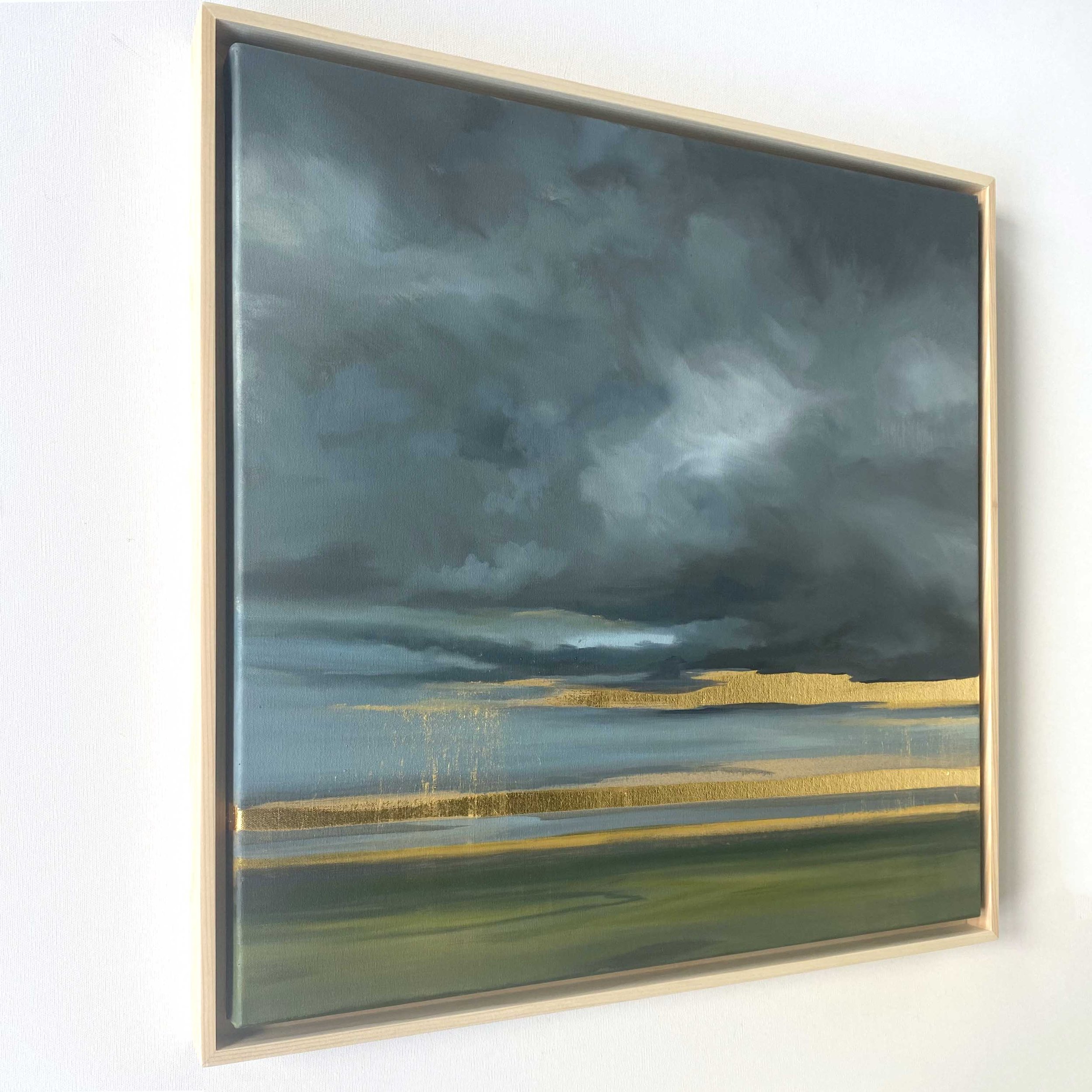 From The Petrichor Paintings (Volume 2) by Allie Dattilio, inspired by the sweet, earthy scent after the first summer storm. Dramatic storm clouds, cool grays, against the contrast of a radiating gold leaf horizon.