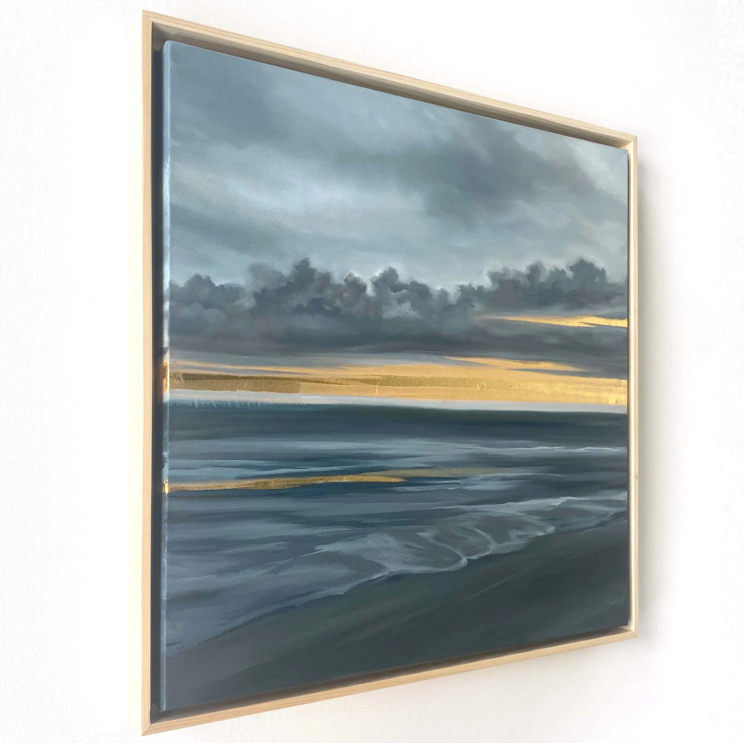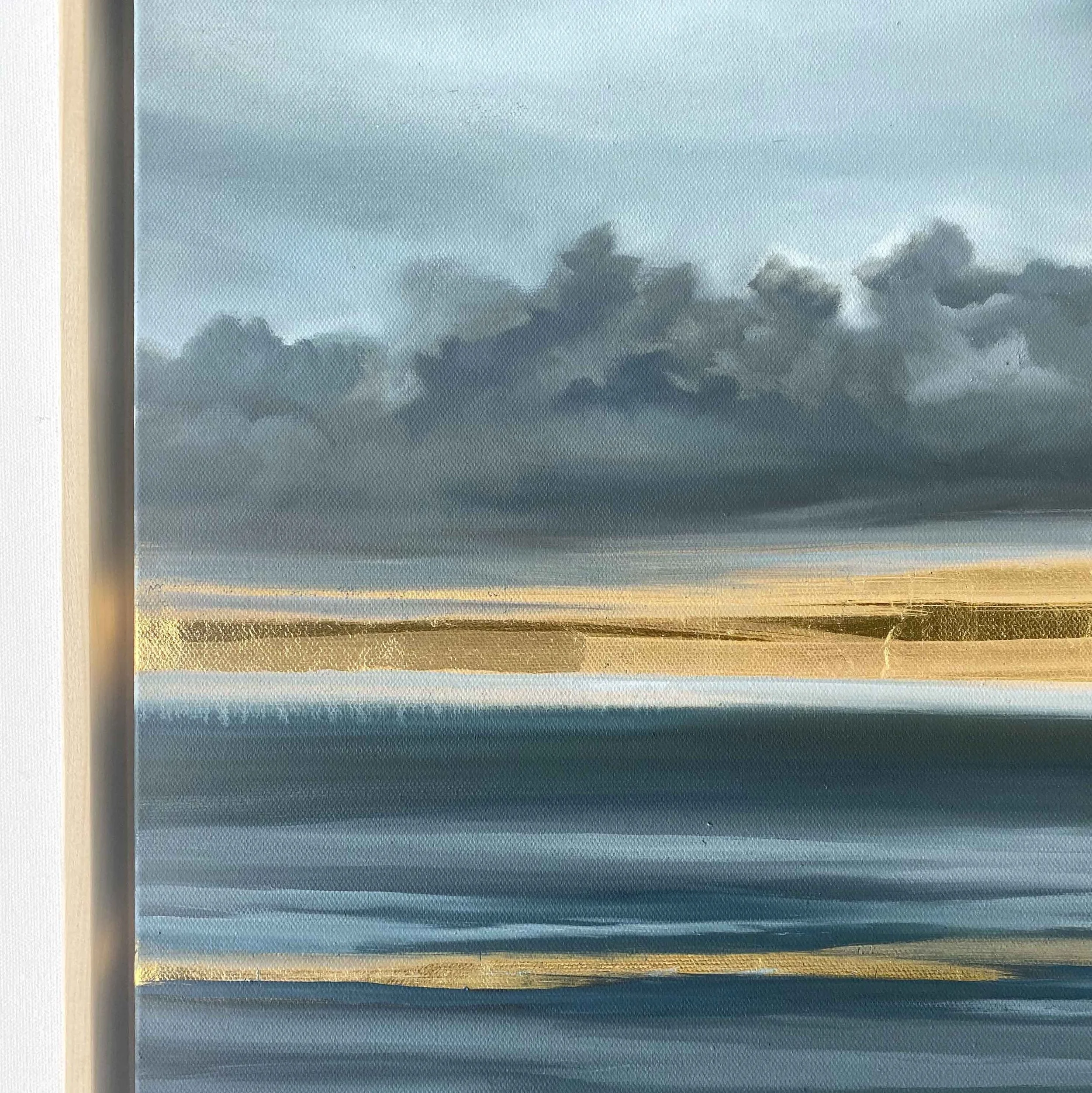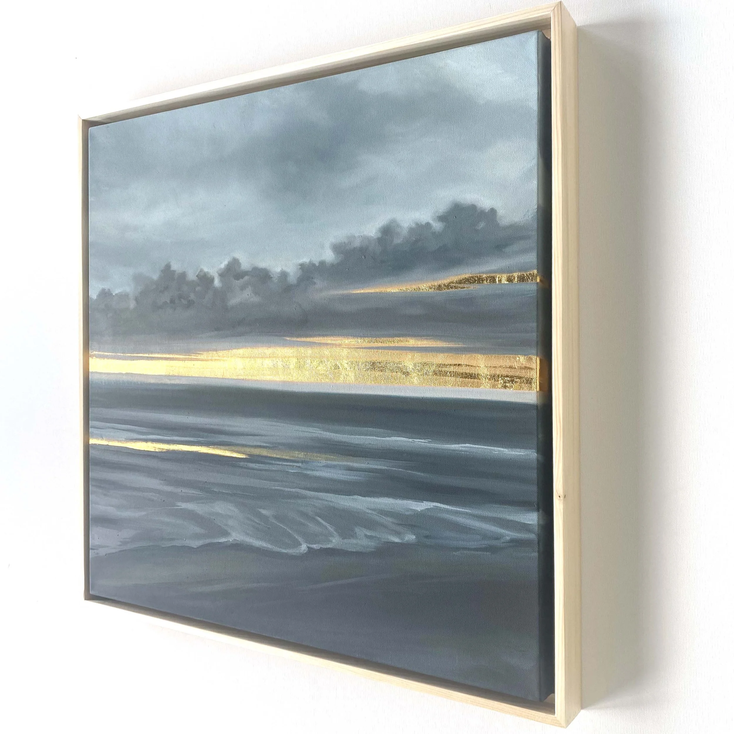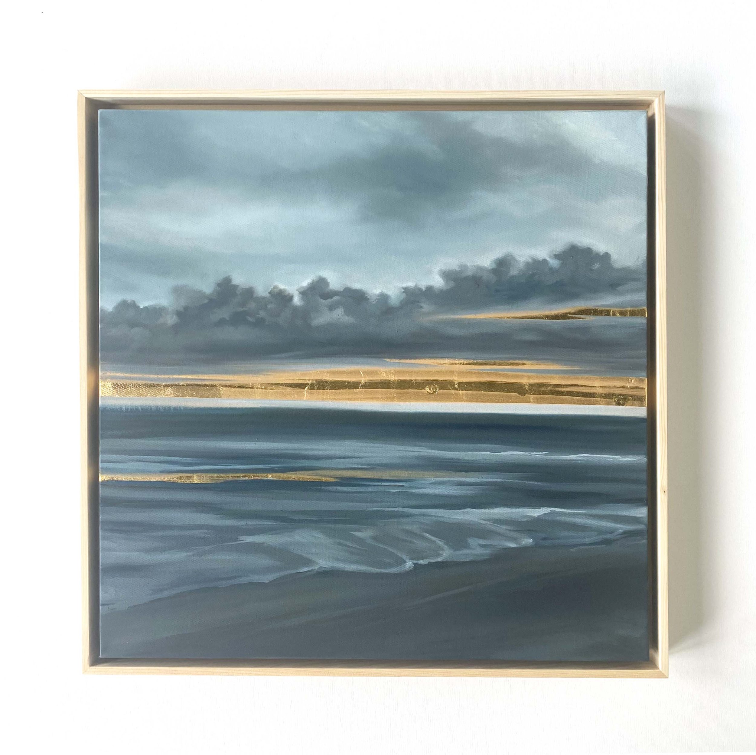 From The Petrichor Paintings (Volume 2) by Allie Dattilio, inspired by the sweet, earthy scent after the first summer storm. Dramatic storm clouds, cool grays, against the contrast of a radiating gold leaf horizon.