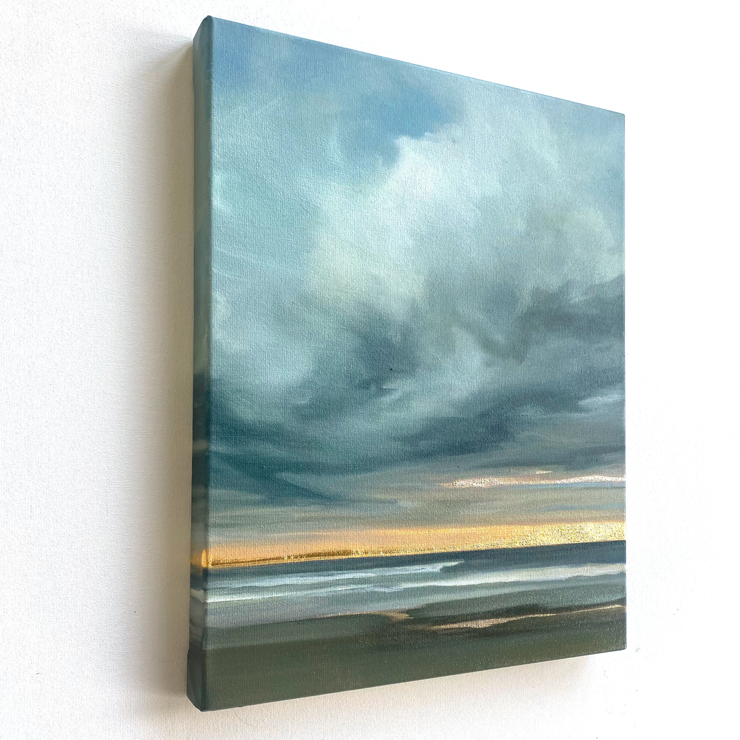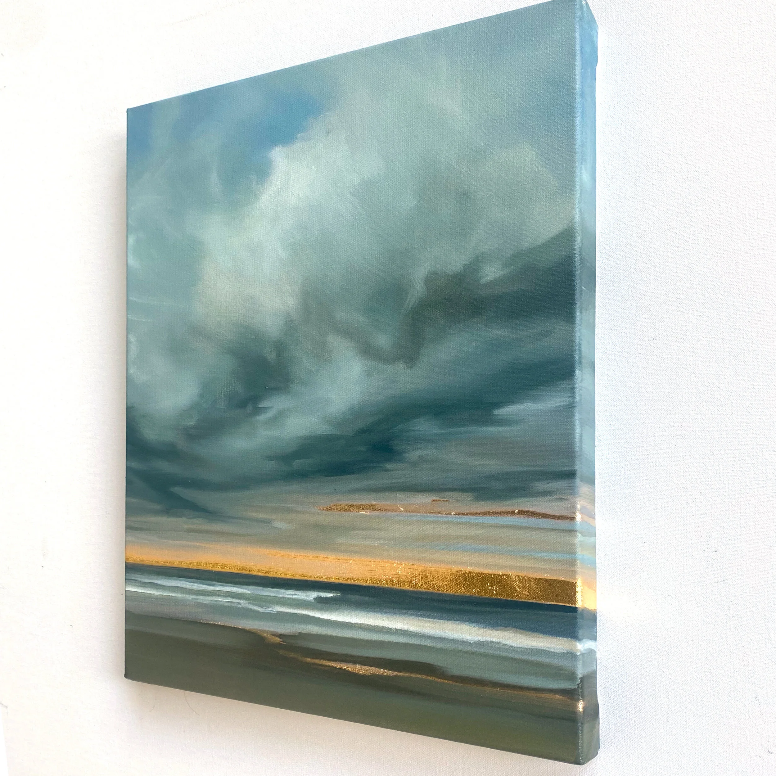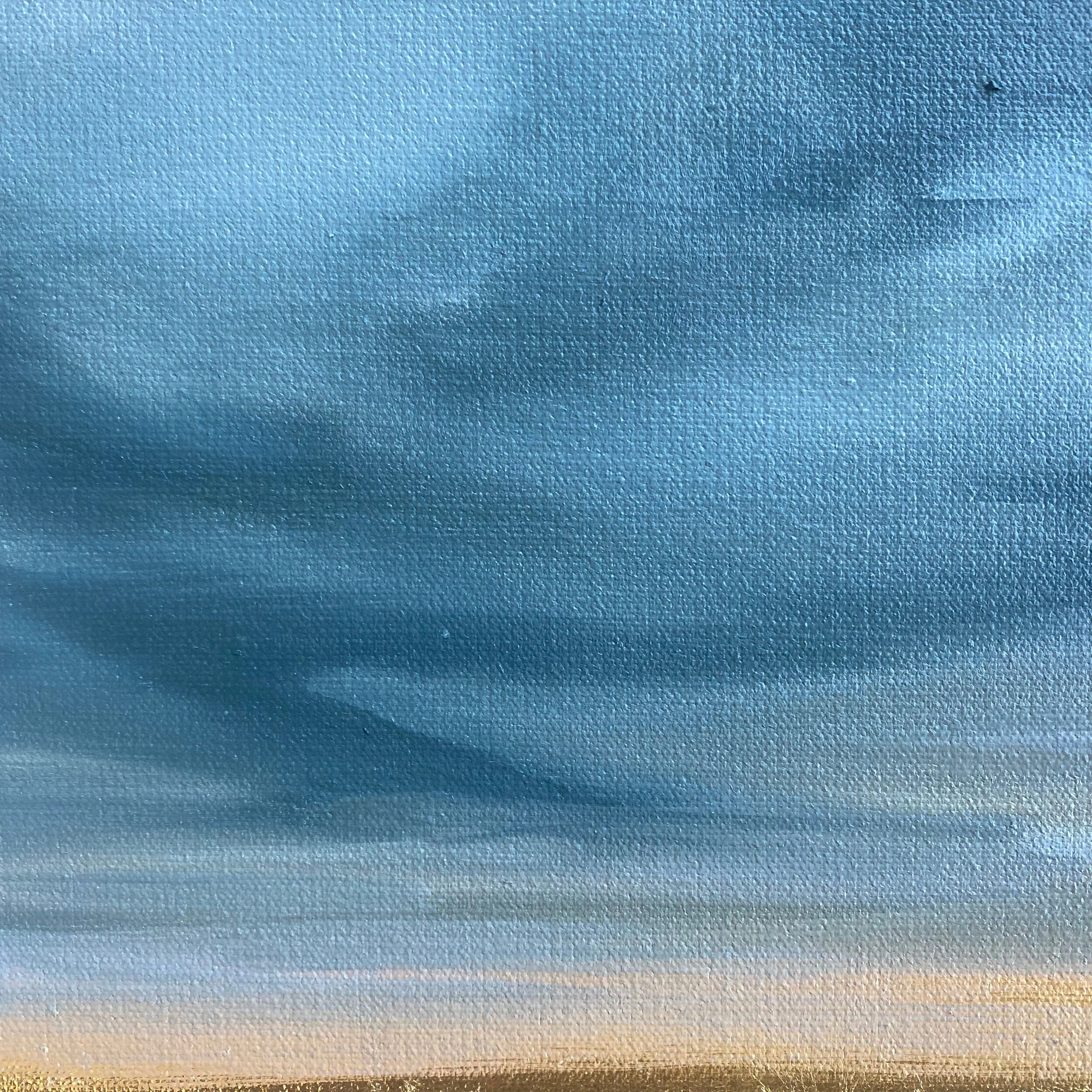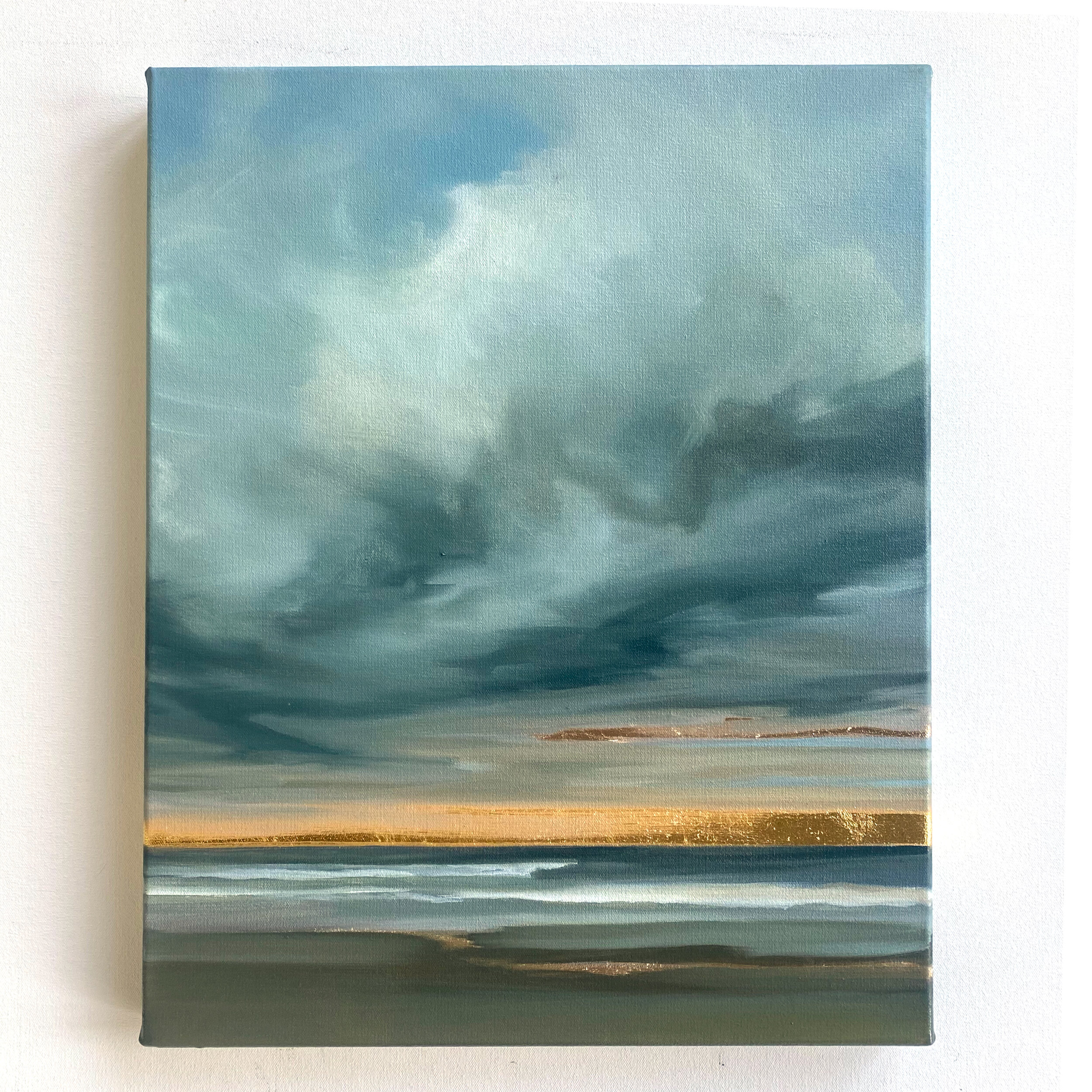 Mixed media and a unique combination of genuine 24k yellow gold and 22k moon gold leaf on canvas, 16” x 20”.