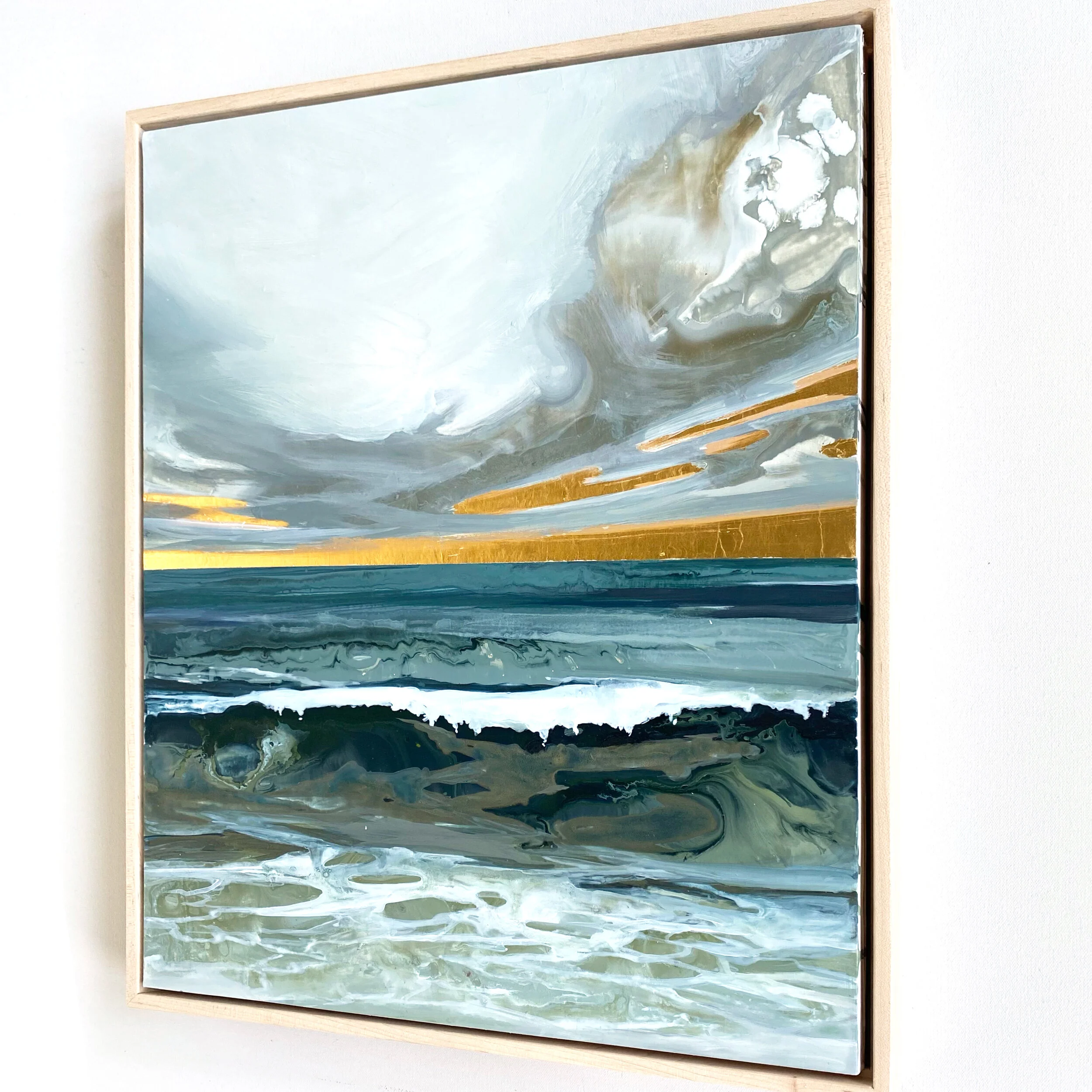 Mixed media and 24k gold leaf on cradled wood panel, 16” x 20” x 1.5”.
