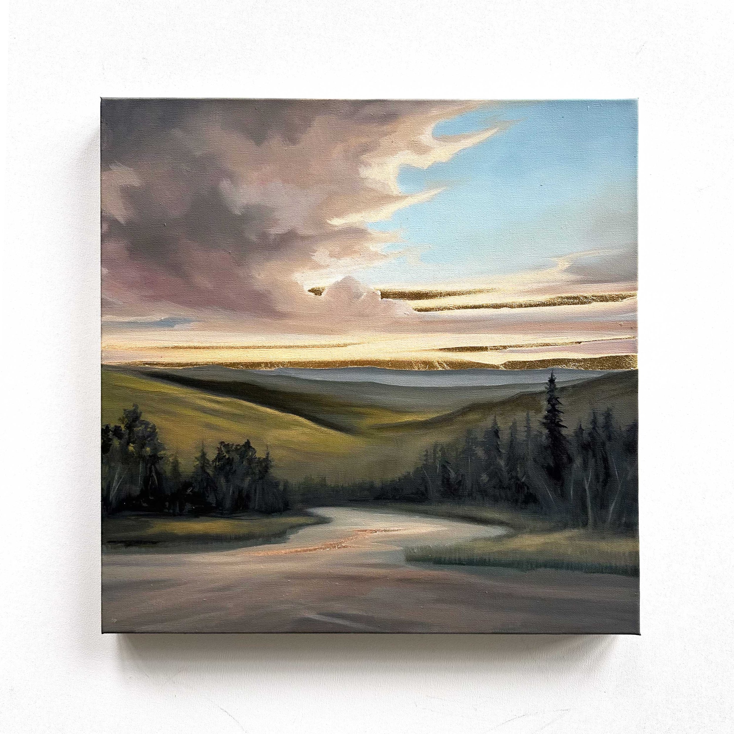Oil paint and genuine 24k yellow gold leaf. Canvas: 20” x 20” x 1.5”.
