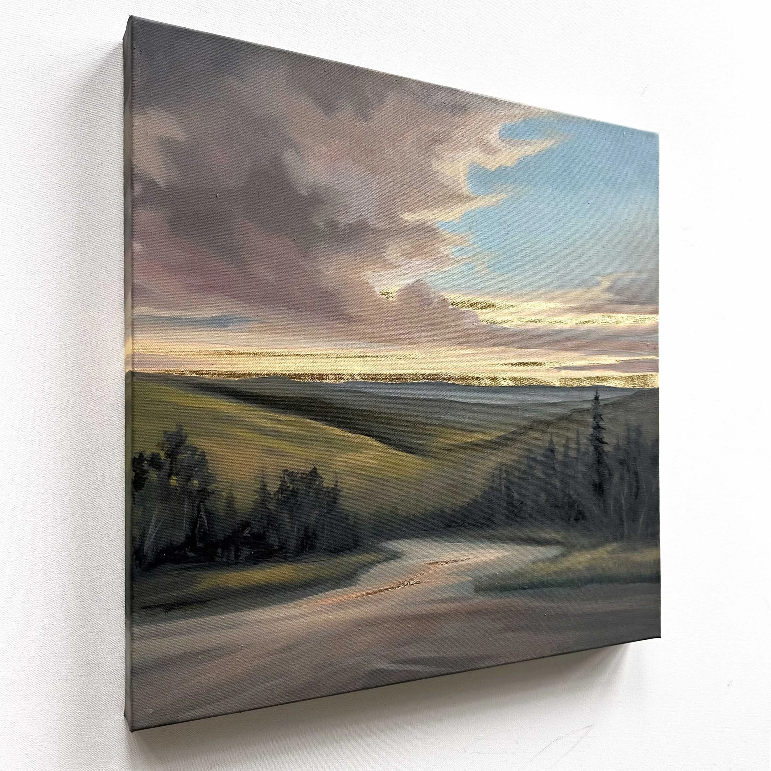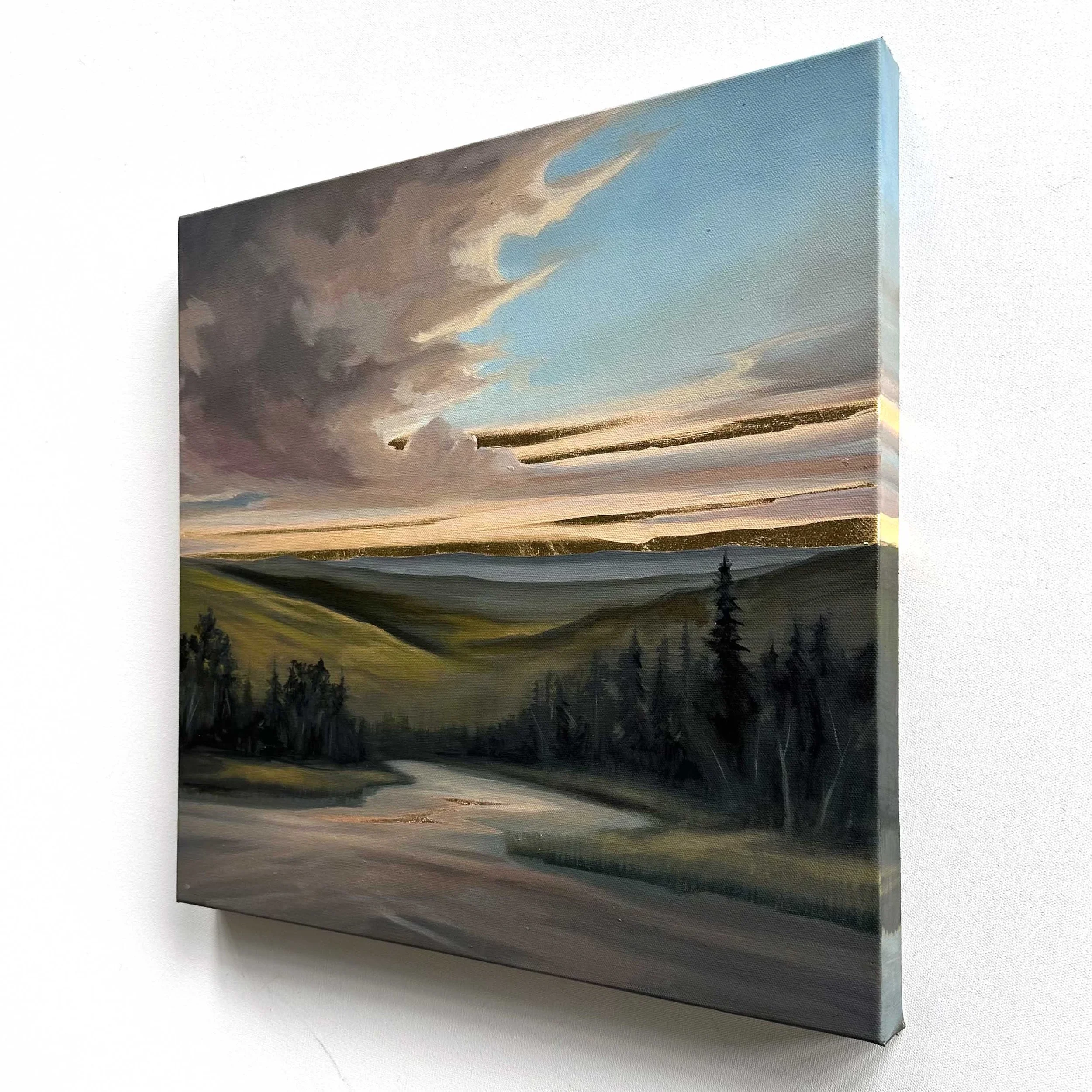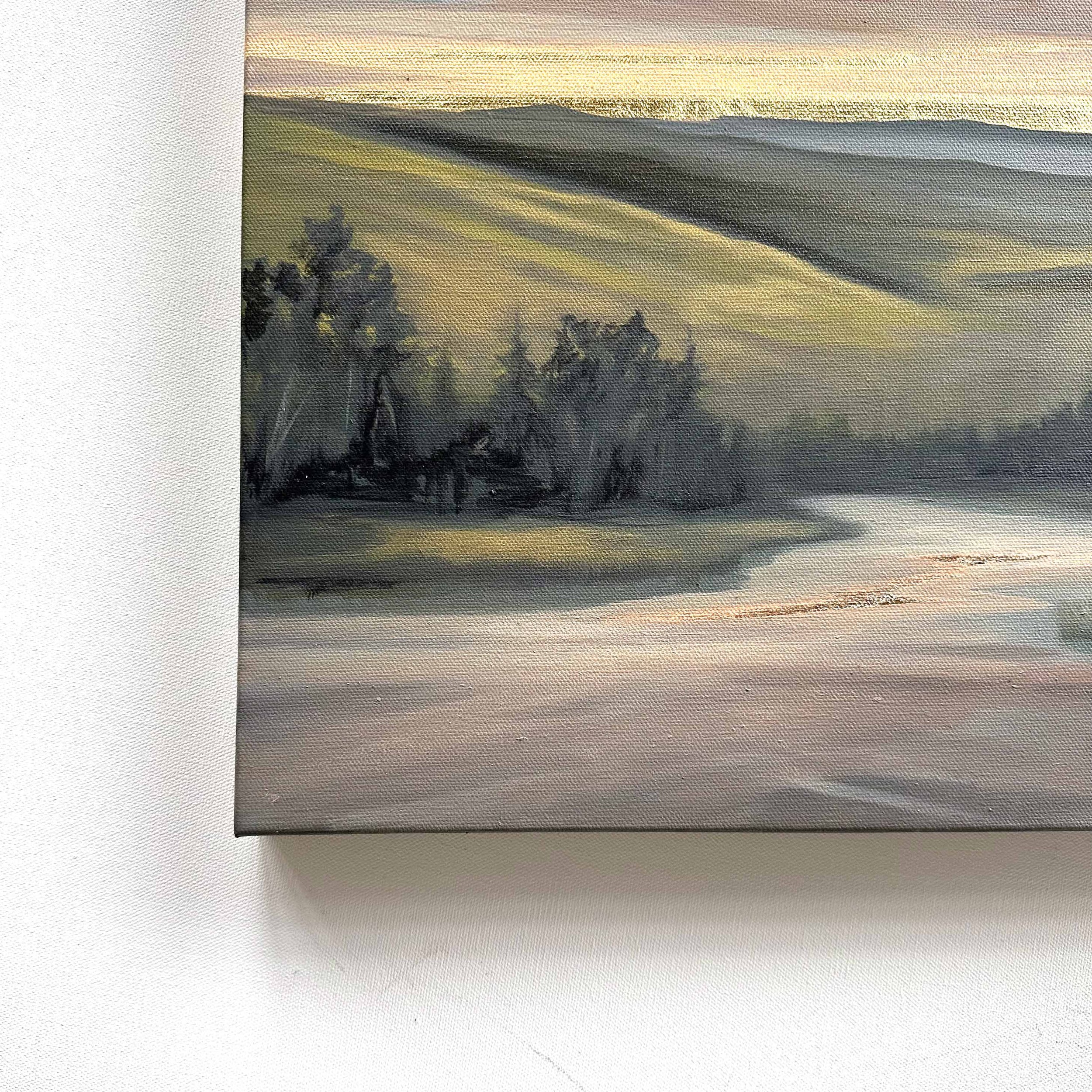 From The Verdure Collection by Allie Dattilio, inspired by lush greens of trees and swaying grasses, the mist caught beneath the shadows, and the glow of a setting sun peaking through the horizon branches.