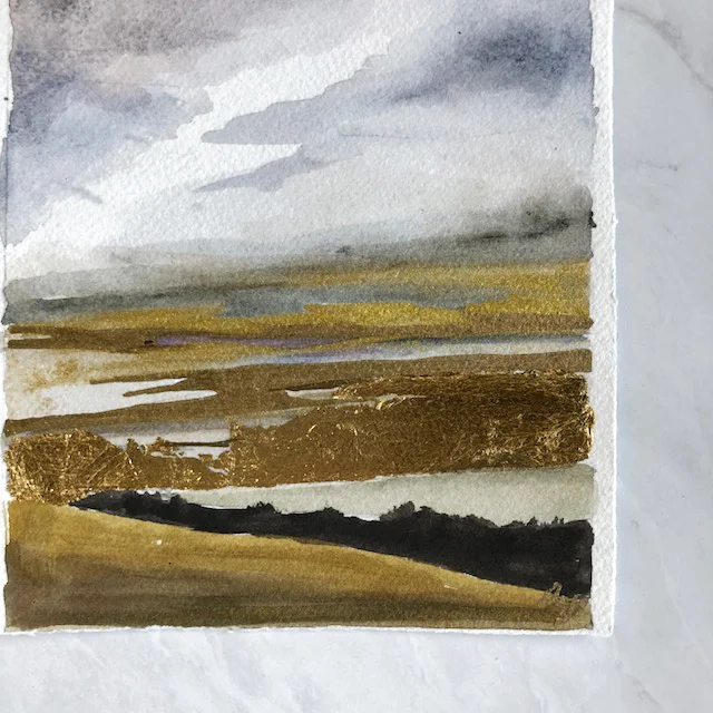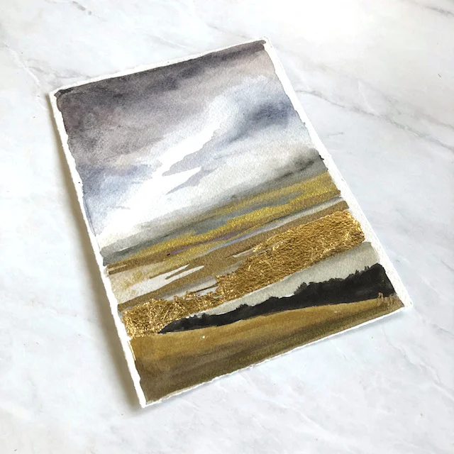 Watercolor, 24k gold leaf, ink and pigment. Warm white paper, hand torn edges.