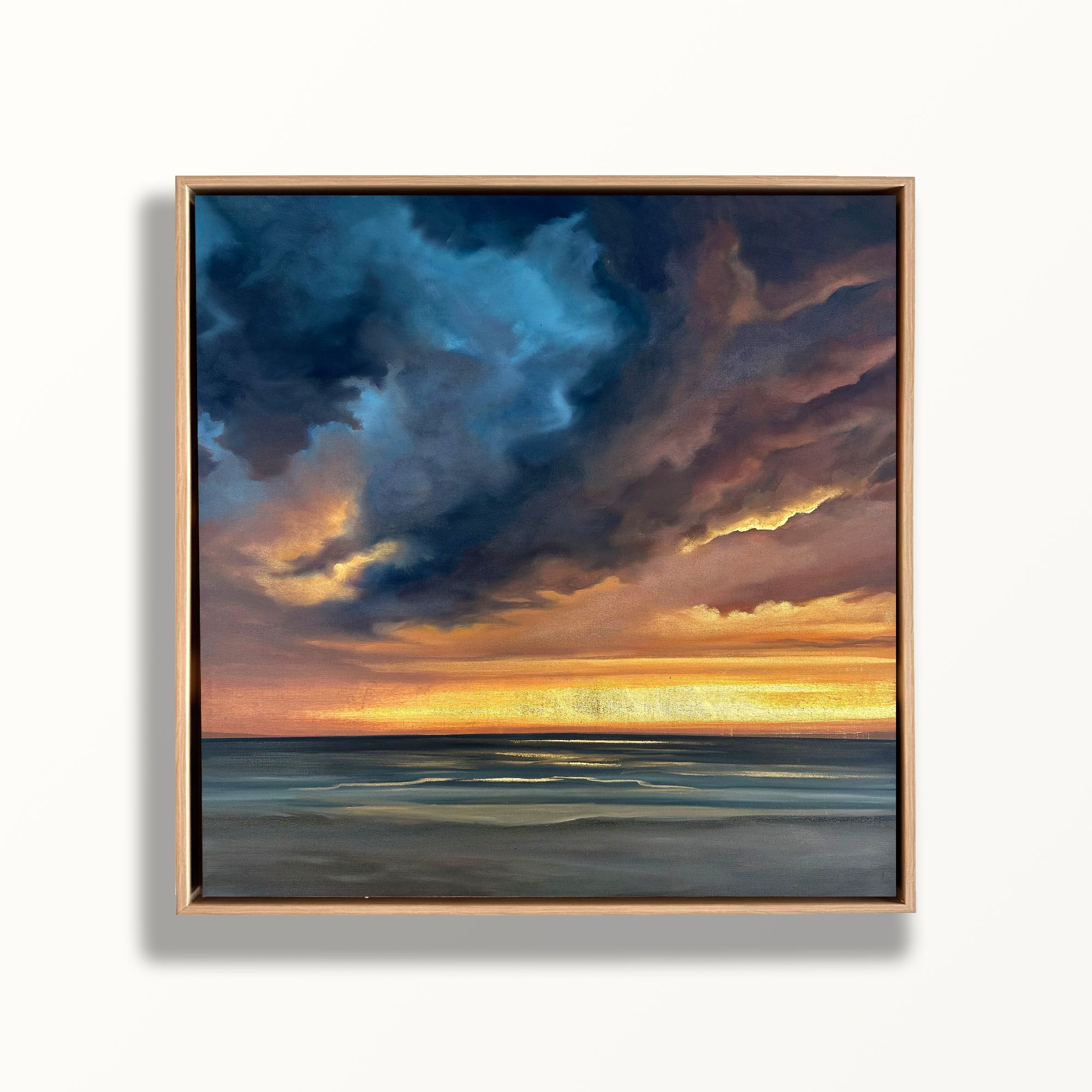 Custom framed in a natural finished, maple floater frame. Overall dimensions: 31” x 31” x 2”
